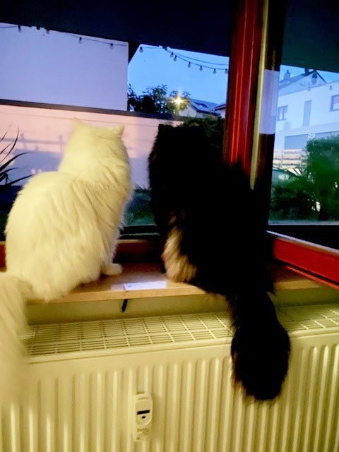 wir haben Angelo und Amadeo umgetauft: die beiden heißen jetzt Suko und Iro. Sie sind nun 4 Wochen bei uns und haben sich rasch bei uns eingelebt. Sie kommen gerne zum Kuscheln vorbei und lieben es, am Abend oder Morgen am offenen Fenster zu sitzen und die Vögel zu beobachten. Getobt wird entweder gemeinsam und dann durch alle Zimmer oder mit dem Stoffbällchen.