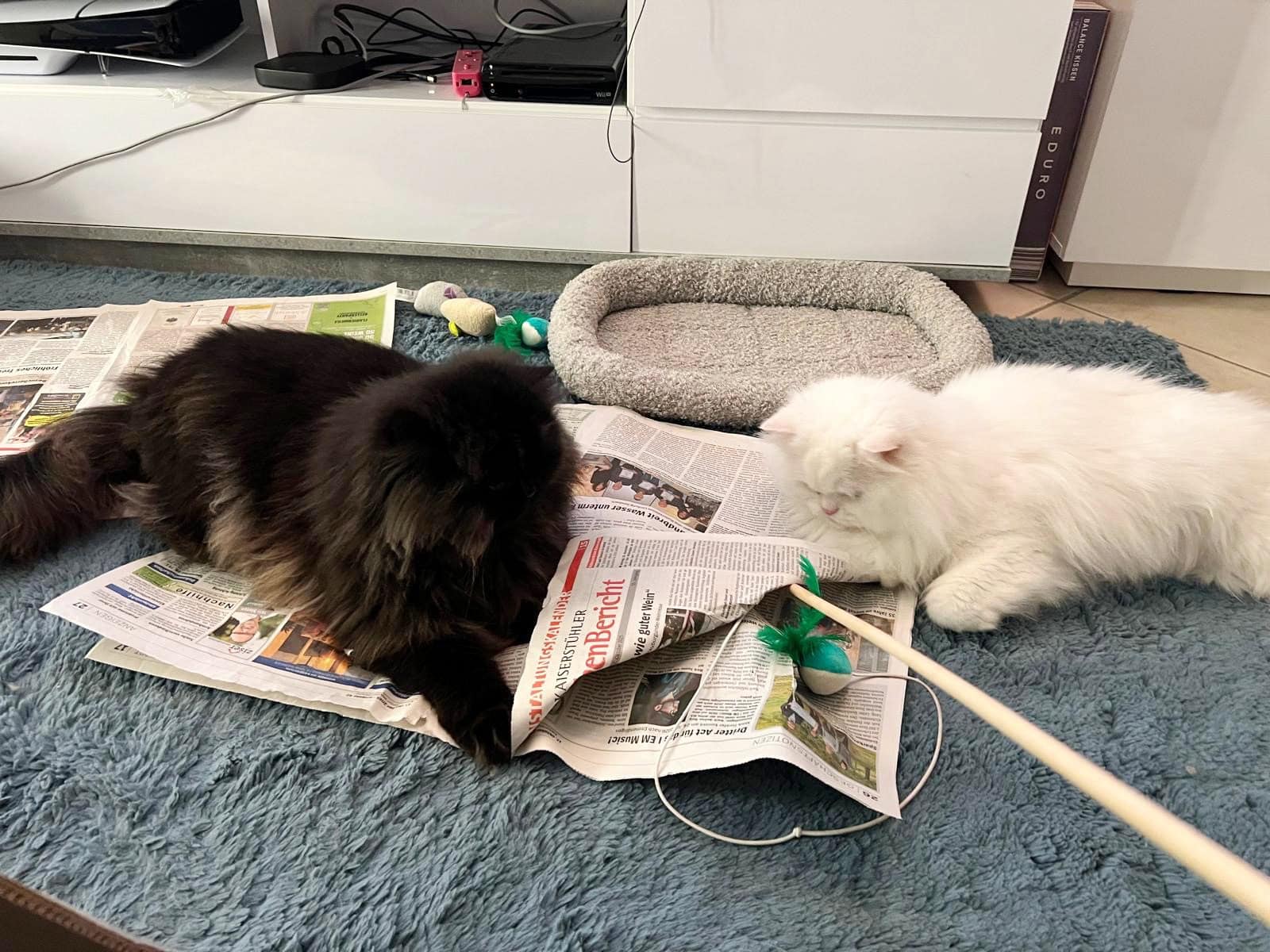 wir haben Angelo und Amadeo umgetauft: die beiden heißen jetzt Suko und Iro. Sie sind nun 4 Wochen bei uns und haben sich rasch bei uns eingelebt. Sie kommen gerne zum Kuscheln vorbei und lieben es, am Abend oder Morgen am offenen Fenster zu sitzen und die Vögel zu beobachten. Getobt wird entweder gemeinsam und dann durch alle Zimmer oder mit dem Stoffbällchen.