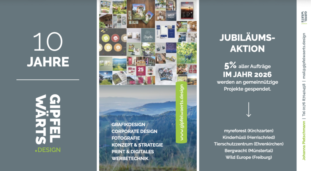 Grafikdesignerin und Fotografin Johanna Pietschmann von gipfelwärts.DESIGN im Münstertal hat 2026 10-jähriges Jubiläum und spendet 5% ihrer Einnahmen an gemeinnützige Projekte. Wir, das Tierschutzzentrum Ehrenkirchen, sind auf der Liste der Spendenempfänger.